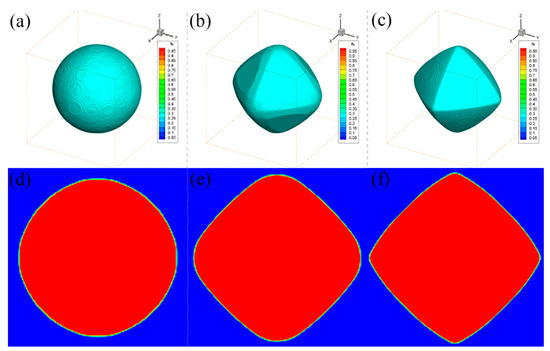 Figure 3a shows the results of the three-dimensional solid ratio of the equilibrium shape of the numerical simulation. It can be seen that the three-dimensional results are the standard octahedral shape, showing a typical effect of high anisotropy.