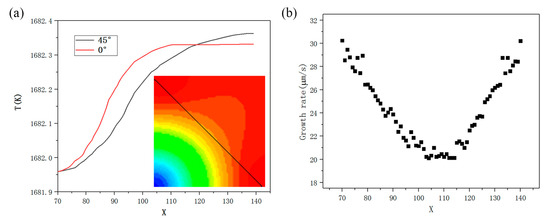 The difference of crystal growth morphology caused by the anisotropy of interface energy is also reflected in the temperature field of different growth directions. From the simulation results in Figure 4a, it can be seen that the temperature curve of (100) preferred growth direction (marked as 0° direction in the figure) rises rapidly at the beginning of growth, then the temperature curve area is gentle and finally close to the level. Compared with the temperature curve in the (111) direction, the temperature curve in the (111) direction (marked as 45° in the figure) presents a relatively gentle temperature rise, and finally crosses the temperature curve in the vertical direction, which is higher than the vertical direction. The lower right corner of Figure 4a is the quarter temperature field distribution.