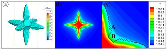Figure 7 shows the simulation result of facet dendrite, and the boundary condition is hexahedral adiabatic. Figure 7a is a three-dimensional facet. The zigzag shape on the primary diameter arm can be seen from the figure, which is consistent with the relevant simulation [9,10]. Figure 7b shows the temperature field and solid-liquid interface morphology. Figure 7c is a quarter enlarged view of dendrite. From Figure 7b,c, it can be seen that the anisotropy of the facet dendrites is higher than that of the non-facet dendrites, and the facet and orientation missing appear at the concave angle a between the arms of the dendrites. There is a phenomenon of annexation in the process of facet growth at B, that is, there are two original facets growing and merging into a larger facet. When the six sides are adiabatic, the released latent heat of solidification diffuses into the melt, resulting in a negative temperature gradient, and the isotherm is concave.