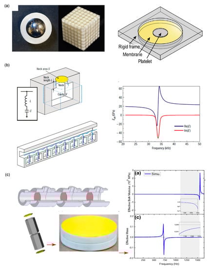 For the realization of negative effective mass density, generally thin membranes with or without embedded mass have been used [41,42,43]. A thin membrane, generally made of soft materials such as natural rubber, latex, or myler sheet, is suitable for responding against incoming acoustic pressure waves. Figure 1a shows the examples of two types of acoustic metamaterials (sonic crystals [11] and decorated membrane-type metasurface [44]) designed for achieving the negative effective mass density. For the realization of negative effective bulk modulus, a Helmholtz resonator has been employed. The resonance-induced effective bulk modulus was first demonstrated by Fang et al. [45] using a waveguide consisting of an array of subwavelength Helmholtz resonators with designed acoustic inductance and capacitance. Figure 1b shows the schematic description of the Helmholtz resonator, the waveguide shunted by daisy-chained Helmholtz resonators, and the effective bulk modulus spectra.
