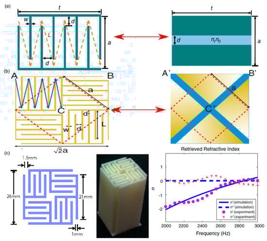 - Xie, Y.; Popa, B.-I.; Zigoneanu, L.; Cummer, S.A. Measurement of a broadband negative index with space-coiling acoustic metamaterials. Phys. Rev. Lett. 2013, 110, 175501. [Google Scholar] [CrossRef]
