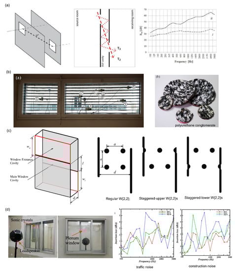 (a) Schematic illustrations of the double-layered façade system with openings and the measured sound reduction index (Rm) of the experimental wall (i): one layer fully closed and one fully open; (ii): both layers fully closed). Reprinted with permission from Bajraktari et al. [83], © 2020 Elsevier Ltd. Licensed under the CC BY-NC-ND license. (b) Photographs of the measurement set-up of the installed glazed surface and the absorptive material (polyurethane conglomerate) used with the louvers. Reprinted with permission from Zuccherini Martello et al. [84], © 2020 by the authors; licensee MDPI, Basel, Switzerland. (c) Schematics of a plenum window unit and the orientations of cylinder arrays relative to the plenum window cavity; regular, staggered-upper, and staggered-lower windows. Reprinted with permission from Tang [87], © 2020 Elsevier Ltd. (d) Experimental reverberation room set-up of the plenum windows with two different settings and the measured insertion loss spectra under traffic noise and construction noises. Reprinted with permission from Lee et al. [89], © 2020 Elsevier Ltd.