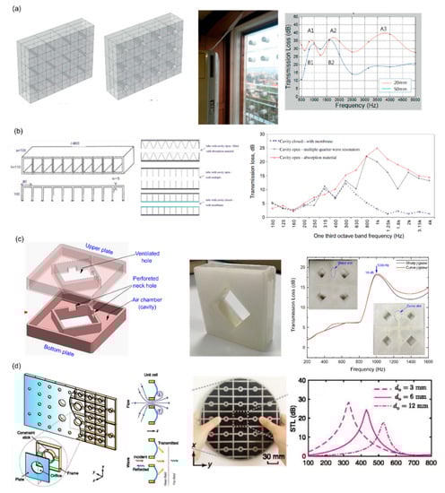 (a) Schematics of the proposed air transparent acoustic window panels (consisting of transformed resonators and air filters with hole diameters of 20 and 50 mm. The dimensions of each cell were 150 mm × 150 mm × 40 mm with a thickness of 5 mm of a transparent acrylic sheet). Photographs are of the installed window panel in building and their measured transmission loss spectra, which was about 30–35 dB in the range of 400–5000 Hz with the 20 mm window and about 20–35 dB in the range of 700–2200 Hz with the 50 mm window. Reprinted with permission from Kim and Lee [90], © 2014 Author(s), licensed under a Creative Commons Attribution 3.0 License. (b) 3D-view and top-view of the multiple quarter-wave resonators. Measured transmission loss spectra of three types of silencers are shown. Reprinted with permission from Wang et al. [91], © 2013 Elsevier Ltd. (c) Schematic details of ventilated metamaterial unit cell composed of two necks and a single chamber. A maximum transmission loss peak of around 18 dB was achieved from the proposed design. Reprinted with permission from Kumar et al. [94], © 2019 Elsevier Ltd. (d) Typical configuration of the perforated and constrained acoustic metamaterial and the measured transmission loss spectra. Reprinted with permission from Wang et al. [95], © 2019 AIP Publishing LLC.