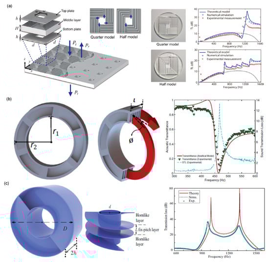 (a) Schematic diagram of the slow-wave metamaterial open panel composed of periodically repeated subwavelength unit cells. Photographs of 3D printed samples (12 mm thickness) and their corresponding transmission loss spectra are shown. Reprinted with permission from Yang et al. [96], © 2018 AIP Publishing LLC. (b) Schematics of the ultra-open metamaterials composed of the central open region and the transverse bilayer structure, featuring six channels coiled in the helix form. The simulated (solid red line) and experimental (dotted green line) acoustic transmittance spectra with the measured sound transmission loss spectrum (dashed blue line) are shown. Reprinted with permission from Ghaffarivardavagh et al. [99], © 2020 American Physical Society. (c) Schematics of a helical meta-unit cell composed of two parts: the central hollowed-out orifice and the surrounding helix and transmission loss spectra of the helical meta unit, theoretical (red line), simulated (black dashed line), and measured (green dots). Reprinted with permission from Sun et al. [100], © 2020 American Physical Society.