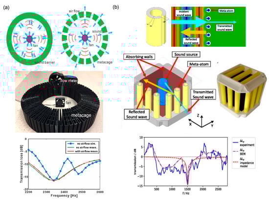 (a) Schematics of the proposed acoustic metacage design. Reprinted with permission from Shen et al. [101], © 2020 AIP Publishing LLC. (b) Schematic representations of the C-shaped meta-atom unit cells and proposed meta-capsule prototype concept: the sound wave is redirected by the meta-grating to the absorbing walls. The manufactured meta-capsule and the transmission spectra of the meta-capsule (simulated and experimental) are depicted. Reprinted with permission from Melnikov et al. [102], licensed under a Creative Commons Attribution 4.0 International License.