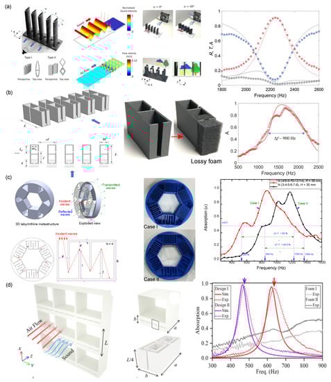The acoustic meta-absorber is a special kind of acoustic metamaterial capable of providing high sound absorption in a targeted frequency range. The low-frequency sound absorption of the metastructures has mainly been achieved by employing the concept of impedance matching, which enhances the coupling of the incident acoustic energy with the absorbers [13]. The acoustic impedance matching with air implies no reflection from the sound-absorbing metastructure, ensuring the maximum absorption of sound energy inside the structure. Since the inception of acoustic metamaterial concepts, a variety of meta-absorbers with subwavelength-scale structures have been realized. These structures include decorated membrane resonators, hybrid resonators, degenerate resonators, coiled Fabry-Perot, coherent perfect absorption, and Helmholtz resonators. For a more detailed description of acoustic metamaterials’ sound-absorbing fundamentals, one can follow the previously published review article by Yang and Sheng [103]. The effectiveness and simplicity of the acoustic meta-absorbers have resulted in them gaining considerable attention. In recent years, several acoustic metastructures have been presented for sound absorption and airflow purposes. Lee et al. [104] presented the absorption-type metamaterials with an ultrahigh sparsity. The sparse acoustic absorber was composed of a periodic array of two-sided Helmholtz resonators (HRs) that permitted fluid flow and light propagation while insulating the incoming sound. They demonstrated two different types of sparse absorber design, the fish shape and double-diamond shape, for simultaneous fluid flow manipulation and optical cloaking, respectively, along with the absorption of sounds. Figure 7a shows the photographs of 3D-printed sparsely arranged acoustic absorbers of both types. They experimentally realized that the sparse absorber array exceeded 90% absorption at the resonance frequency of 2200 Hz with a volume-filling ratio of approximately 26%. Also, the ultrasparse acoustic absorber had shown the excellent tunability for the air-flow-direction control and optical cloaking. A similar kind of sparse absorber has also been demonstrated by Lee et al. [105]. As illustrated in Figure 7b, the meta-absorber consisted of an array of dual resonance unit cells. Each unit cell consisted of two resonators. The upstream resonator is partially filled with foams, and the downstream resonator has an empty hollow cavity with a neck. The dimensions of both these resonators were chosen for the constant operating resonant frequency. The experimental results showed a high absorption bandwidth of 900 Hz obtained from the proposed metamaterials. Such a high bandwidth was obtained due to the addition of loss media, i.e., foams in the sparse absorbers’ design.