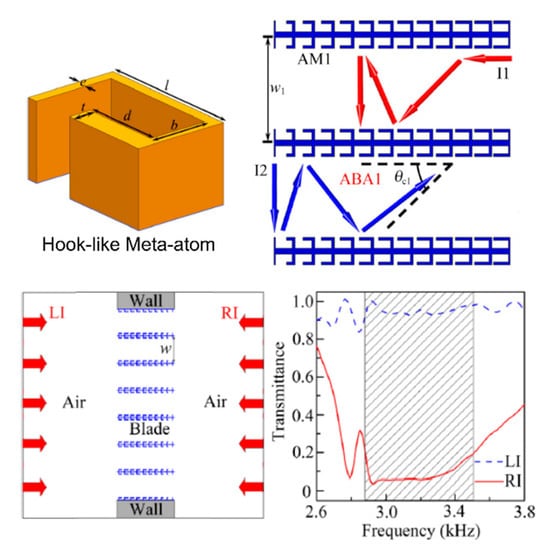 - Ge, Y.; Sun, H.-X.; Yuan, S.-Q.; Lai, Y. Broadband unidirectional and omnidirectional bidirectional acoustic insulation through an open window structure with a metasurface of ultrathin hooklike meta-atoms. Appl. Phys. Lett. 2018, 112, 243502. [Google Scholar] [CrossRef]