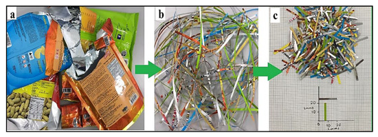 (a) Metalised plastic wastes; (b) Preparation of fibres; (c) 20 mm length waste metalised plastic (WMP) fibres.