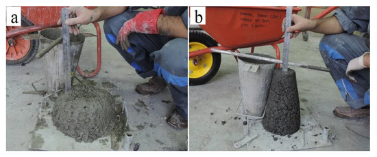 The slump test of (a) plain OPC mix, and (b) POFA-based mix reinforced with WMP fibres.