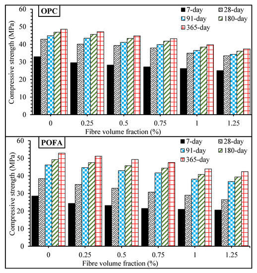 However, beyond 180 days curing of specimens in water, owing to the consumption of POFA and its high pozzolanic nature, the attained strengths of concrete samples were found to be remarkably greater than those of the early age values. For example, at 365 days, the compressive strength values of 52.9, 51.2, 49.3, 47.6, 44, and 42.5 MPa were recorded for the POFA-based mixes with WMP fibre contents of 0%, 0.25%, 0.5%, 0.75%, 1% and 1.25%, respectively. The values obtained are comparatively higher than those values of 48.6, 47.2, 44.8, 43.2, 39.8, and 37.4 MPa, which were recorded for the OPC-based mixes with same fibre contents. It could be observed that the POFA mixes show higher strength values, in association with the OPC specimens for the similar fibre contents. The findings of this study are similar to those reported by Ranjbar et al. [22], who described the significant improvement in the compressive strength of concrete by using POFA as a partial cement replacement with longer curing periods.