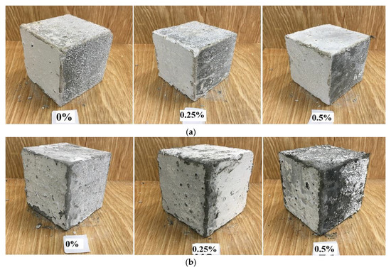 The visual assessment was done on the concrete cubes exposed to 10% MgSO4 solution for 365 days to assess the effects of sulphate on concrete, as illustrated in Figure 7a,b. In this regard, the changes in the shape, size and the surface colour of the cubical samples were inspected and analysed. The colour of concrete specimens can provide comprehensive information on how the sulphate influenced the concrete. Table 4 displays the overall visual inspection of the concrete cubes with and without fibres. At the end of the exposure period, a whitish precipitate was detected on the surface of all concrete specimens, which was the result of sulphate attack. However, these precipices were found to be lower on the surface of POFA-based specimens as compared to those of OPC specimens. Due to the higher amount of lime in the OPC specimens, as a result of sulphate attack, the lime particles leached and deposition, and, therefore, calcium sulphate (CaSO4) was formed in higher quality, and the whitish precipitate was formed on the outer surface of specimens [30]. It was also observed that cracks were formed on the surface of plain concrete specimens.