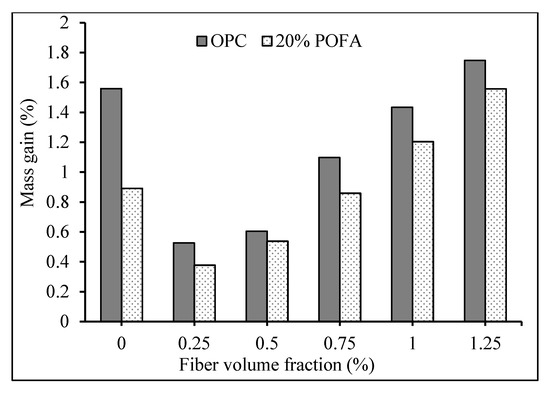 In this study, the influence of sulphate attack on the variation in the mass of concrete specimens after one year of immersion was assessed. Figure 8 displays the changes in the mass of cubical samples at one year of immersion in a sulphate solution. A similar tendency was observed for all specimens reinforced with WMP fibres, in which the masses of all specimens were gained by absorbing the sulphate particles after one year of exposure. It can be seen that the masses of plain OPC and POFA concrete mixes gained by about 1.56% and 0.9%, respectively. Nevertheless, the addition of WMP fibres up to 1% fibre content into the concrete mix considerably prevented the gain in the mass of the cube samples. For instance, the masses of OPC-based concrete specimens reinforced with 0.25%, 0.5%, 0.75% and 1% fibres gained by 0.53%, 0.6%, 1.1% and 1.43%, respectively, whereas for the POFA-based specimens the masses gained by 0.38%, 0.545, 0.88% and 1.2% for the same fibre content, respectively. The outcomes exposed that the substitution of OPC by 20% POFA resulted in a significant reduction in the mass gain of concrete specimens with and without fibres. However, a further increase in the fibre content beyond 1% increased the mass gain of the samples immersed in a sulphate solution. The lower percentage of mass gain in the specimens reinforced with WMP fibres could be due to the development of a grid structure in the matrix by fibres, which prevented the diffusion and disruption of harmful constituents into the concrete specimens. Therefore, using POFA as a partial cement replacement in concrete under a sulphate environment is beneficial to provide a dense microstructure and filled up the pores in the matrix by superior pozzolanic action [32,33].