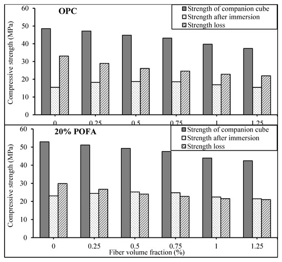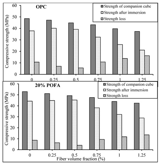 In this study, to assess the effects of the sulphate attack on the strength performance of concrete, the residual compressive strength of specimens after one-year immersion in MgSO4 solution was carried out. The results of the test and comparison amongst the water-cured specimens and those specimens exposed to sulphate solutions are demonstrated in Figure 9. Besides, the variation in the strength values of specimens cured in water and those exposed to sulphate attack was termed strength loss. It was noted that the compressive strength of all concrete mixes was affected by sulphate attack. When the companion samples gained their strength, and the hydration process was continued in the water at room temperature, the test samples were suffered in sulphate solution and lost their strength. The results obtained also indicated that the rate of strength losses was higher in OPC-based concrete specimens than those of POFA-based specimens for all fibre volume fraction mixes. For instance, the strength loss values of 10.6, 7.1, 5.6, 10.8, 13.8 and 16.3 MPa were recorded for OPC-based specimens reinforced with 0%, 0.25%, 0.5%, 0.75%, 1% and 1.25% fibres, respectively, while in POFA-based specimens, comparatively lower strength loss values of 8.6, 6.3, 4.1, 9.4, 11.8, and 13.5 MPa were noted for the same fibre dosages, respectively. This reduction in the strength of all mixes was due to the long-term immersion of specimens in the MgSO4 solution. Moreover, the formation of cracks in the OPC-based specimen as a result of sulphate attack leads to accelerate the loss in strength of concrete. However, the combination of POFA and WMP fibres minimised the development of cracks and prevented the spalling of concrete specimens. The finding of this study is comparable to those results reported by Al-Rousan et al. [34] on the potential use of polypropylene fibres against the sulphate attack in concrete.