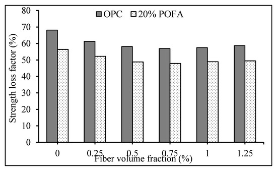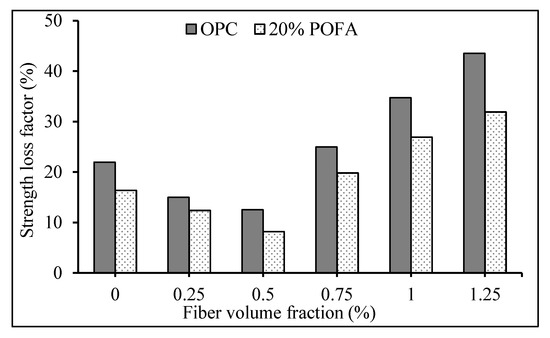 The strength loss factor (SLF) of concrete mixes owing to the deterioration by sulphate attack was also evaluated. The outcomes of SLF after one year of exposure to the sulphate solution are demonstrated in Figure 10. It was observed that SLF developed for all concrete mixes, which indicates the effect of sulphate attack on the strength of concrete. The results show that the SLF values are comparatively higher for the OPC-based specimens as compared to those of POFA mixes. It is interesting to note that a lower SLF value was found for the POFA mix containing 0.5% WMP fibre, at 8.2%. However, the SLF values increased with the rise in fibre content.