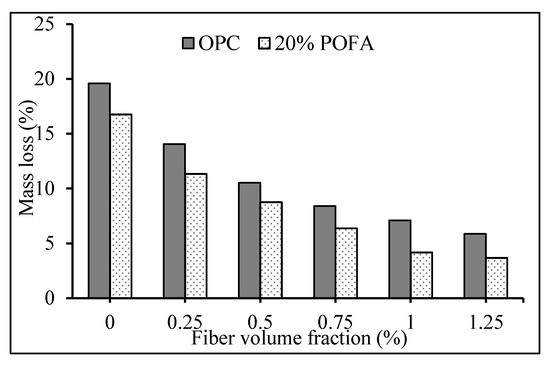 The changes in the mass of concrete cubes submerged in an acid solution for one year are shown in Figure 14. A similar trend of mass loss was observed for all mixes after one year of exposure to H2SO4 solution. The results show that the rate of mass losses in OPC-based specimens was comparatively higher than those of POFA-based specimens. It indicates that the OPC specimens washed out at a higher rate when immersed in an acid solution. This higher rate of leaching in the OPC specimens might be due to the existence of CaO at a higher volume in the OPC than POFA, which quickly washed out when coming into contact with acid [39,40]. However, by reinforcing OPC specimens with WMP fibres, the rate of mass loss decreased significantly. For instance, by adding fibres of 0.25%, 0.5%, 0.75%, 1% and 1.25%, the mass losses of 14.1%, 10.5%, 8.4%, 7.1% and 5.9% were recorded, respectively, which are comparatively lower than that of 19.6% mass loss noted for plain OPC mix without any fibre. Moreover, the rate of mass losses in the POFA mixes containing WMP fibres was considerably lower than those of OPC reinforced mixes. The mass losses of 11.3%, 8.7%, 6.4%, 4.2% and 3.7% were recorded for the fibre dosages of 0.25%, 0.5%, 0.75%, 1% and 1.25%, respectively, which are all lower than that of 16.8% recorded for plain POFA-based mix. With the addition of WMP fibres, through the bridging action of fibres the aggregates and cement past connected with a strong bond, and therefore, degradation and spalling of concrete specimens significantly reduced.
