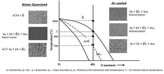 16] promote displacive (diffusionless) β→α-phase transformation, leading to the formation of martensitic microstructure. Moderate to low cooling rates, however, lead to diffusional β→α-phase transformation to form more stable microstructure such as basket weave and Widmanstätten microstructures. A schematic diagram of the Ti6Al4V phase transformation and typical morphology of the resultant microstructures is shown in