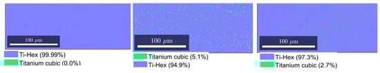 Figure 5 shows the EBSD phase maps of the as-built and heat-treated DMLS Ti6Al4V (ELI) samples. This figure highlights the absence of the β-phase in the Ti6Al4V (ELI) alloy microstructure, immediately after production in the as-built state. A small proportion of about 5.1% and 2.7% of β-phase was detected in the heat-treated samples B and C, respectively.