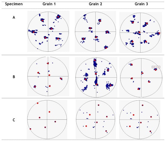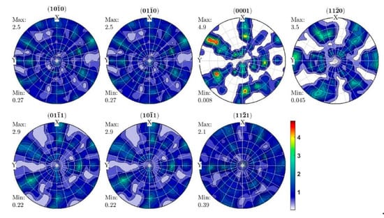 The maximum intensities of texture for samples A are significantly weaker in comparison with the maximum intensities of texture for the other samples, with values in the range of 2.1 to 4.9. There is a slight improvement of the maximum texture intensity values in samples B with the values in a range of 4.0 to 10.0. A significant improvement in texture intensity is noted in samples C with maximum values in the range of 6 to 24. This remarkable improvement is a result of colonies of α-grains that contain numerous parallel α-lathes with the same crystallographic orientation shown in