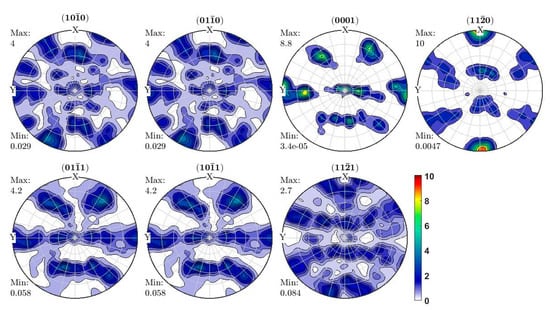 Figure 10, the overall texture of transformed α′/α-grains were weaker than those of the β-grain texture. Undoubtedly, this suggests that there was variant selection during the β→α-grain transformation. Thus, the α-grain texture was diluted, as there are 12 possible variants that could possibly form from a single prior β-grain.