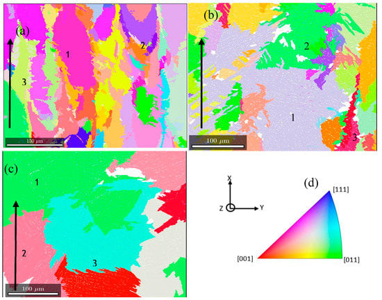 Figure 11 show the Euler orientation maps and pole figures of the reconstructed prior β-grains, respectively, from the EBSD data set of