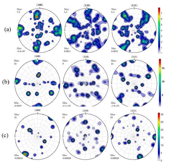 Figure 11a,b, respectively, shows the (100) poles to be mainly concentrated in the X-build direction as the intensity of these planes is higher than the rest. The development of this typical fibrous texture of the β-grains with the ⟨