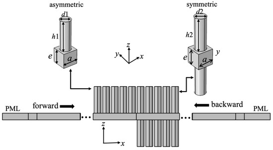 We considered a meta-plate consisting of periodic pillars in a square lattice deposited on a thin plate, either symmetrically or asymmetrically, as shown in Figure 1. The lattice constant was a = 100 μm and the plate’s thickness was e = 80 μm. The pillars in both symmetric and asymmetric parts were identical with a height h1 = h2 = 320 μm and a diameter d1 = d2 = 80 μm. The entire geometry was made of isotropic steel, with the elastic modulus E = 200 GPa, Poisson’s ratio v = 0.3 and mass density ρ = 7850 kg/m3. Perfectly matched layers (PML) were placed at the two ends to reduce the wave reflection from boundaries. The transmission calculations throughout this work were implemented with the frequency domain.