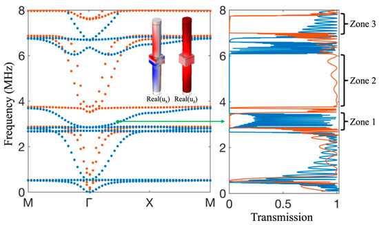 Left panel: Dispersion curves of the symmetric-sided pillared meta-plate along the first irreducible Brillouin zone. The orange and blue bands represent the symmetric and antisymmetric Lamb modes with respect to the middle plane of the plate, respectively. Right panel: Transmission spectra of A0 (blue) and S0 (orange) Lamb waves across 15 symmetric-sided unit cells along the ΓX direction (see the inset). The wave propagation in not allowed for the S0 Lamb wave in Frequency Zone 1 (2.9–3.5 MHz) and Zone 3 (7–7.7 MHz), and for A0 Lamb wave in Frequency Zone 2 (3.8–6 MHz), which match well with the bandgaps of corresponding symmetries. The real parts of ux and uz of the antisymmetric eigenstate at the green dot in the dispersion curves are plotted as the insets, where the red and blue colors mean positive and negative values, respectively.
