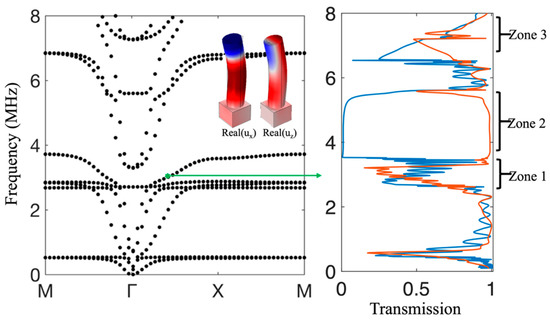 For the asymmetric pillared meta-plate, the dispersion curves shown in Figure 3 have similar bands as in Figure 2. However, symmetric and antisymmetric modes can no longer be distinguished. Both of the cross-section fields of real (uz) and real (ux) are in phase for the eigenmode at the green dot in the dispersion, so that it allows the propagation for both modes as pointed to by the arrow. This can be noticed in the transmission curves shown in the right panel of Figure 3, using the same definition as in Figure 2. Indeed, Figure 3 shows that both the S0 and A0 Lamb waves can be transmitted in Frequency Zones 1–3, which were forbidden bands for one symmetry in Figure 2. This is due to the fact that an incident S0 or A0 wave will generate in the phononic crystal modes which do not obey the symmetry rule, hence allowing the simultaneous transmission of the S0 and A0 waves after leaving the phononic crystal. Therefore, the geometry shown in Figure 1, where this asymmetric pillared structure is associated in tandem with symmetric one functioning as the metamaterial filter, is able to realize asymmetric propagation, in the sense that the same polarization cannot carry out the same energy when traveling from the opposite sides of the structure.