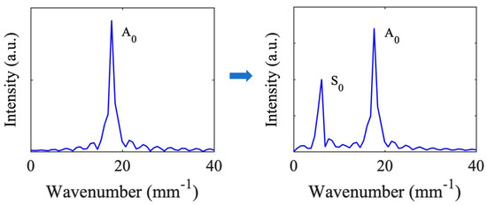 Illustration of the Fourier transformation of mode conversion of an A0 incident Lamb mode into both A0 and S0 modes after traversing the asymmetric-pillared meta-plate at 5 MHz. The figures show the discrete fast Fourier Transformation (FFT) of the out-of-plane displacement within an area on top of the plate. The left figure corresponds to the incident A0 Lamb wave and the right figure refers to the transmitted wave containing both of the S0 and A0 Lamb modes.