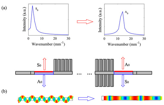 To verify the asymmetric propagation behavior, the forward (black) and backward (red) transmission with either A0 or S0 mode excitations are shown in the left and right panels of Figure 5, respectively. The A0 and S0 Lamb waves are excited by a force along the z direction and x direction, respectively, in a cross-section of the plate. Since the dominant displacement components for A0 and S0 modes are uz and ux, respectively, it is not correct to directly adopt the same transmission definition as in Figure 2 and Figure 3 due to the occurrence of a mode conversion in the combined structures. Instead, we employ the transmission definition in Figure 5 as 20log(|u|/|uref|), where |u| is the volume integrated absolute value of the total displacement of the pillared plate in the downstream while |uref| is the same implementation in the reference plate without any pillar. Let us first consider an A0 incident field (Figure 5a). In the backward direction, the symmetric-pillared structure prohibits the propagation in Zone 2 and the transmission drops to zero. However, in the forward direction, the asymmetric-pillared structure breaks the symmetry of the incident wave and allows the final transmission of the symmetric part of the waves. Let us notice a huge difference of 200 dB between the forward and backward directions. A similar analysis can be applied to an S0 excitation where the transmission is asymmetric in Zones 1 and 3. To discuss the phenomenon of mode conversion during the forward transmissions with S0 and A0 excitations, two complementary illustrations are given in Figure 6. In the first case of S0 excitation (Figure 6a), an FFT analysis of the displacement field shows that the wave vector of the transmitted wave corresponds to an A0 wave. In the case of A0 excitation, we present in Figure 6b the representation of the wave in real space showing the conversion of the incident wave to an S0 transmitted wave.