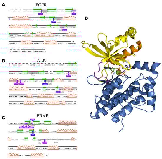 The sequences of the three kinases focused on within this review are represented with relevant residues highlighted. (A) Epidermal Growth Factor Receptor (EGFR) (UniProt ID: P00533), (B) Anaplastic Lymphoma Kinase (ALK) (UniProt: ID Q9UM73), and (C) Rapidly Accelerated Fibrosarcoma Homologue B (BRAF) sequences are represented with relevant motifs highlighted. (D) c-MET in complex with ATP (PDB: ID 3DKC) is used as a general representation of a kinase domain with the C-terminal lobe colored blue with hinge motif colored pink, N-terminal lobe is colored yellow with the P-loop residues backbone depicted as sticks and the regulatory αC-helix colored in orange. Nitrogen and oxygen atoms are colored blue and red, respectively. The ATP molecule is depicted with carbon atoms in green and phosphate atoms in orange, magnesium ion is depicted as a green sphere.