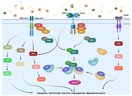 Summary of the main signaling pathways involving the erbB family, EML4-ALK fusion protein and RAF family. RAS family implication is also represented in either GDP- or GTP-bound states. These signaling pathways regulate and control important downstream cellular functions such as apoptosis, cell growth, survival, angiogenesis, and migration.