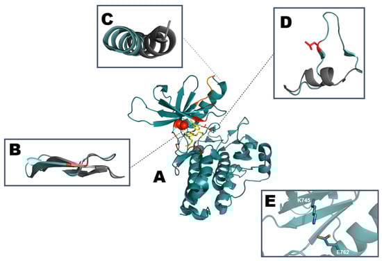 The first crystallographic structure obtained in the active state was WT EGFR in the apo form (PDB: ID 1M14). In the active EGFR TK domain conformation, the αC-helix becomes highly structured, adopting an αC-in conformation allowing the formation of the catalytically important salt bridge (E762- K745). Furthermore, the A-loop is positioned away from the active site, allowing substrate access to the catalytic site [52].