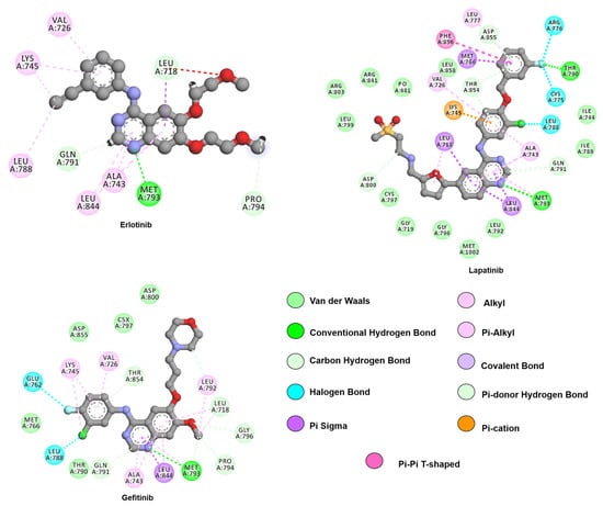 Two-dimensional representation of lapatinib and first-generation inhibitors, gefitinib and erlotinib. The 4-aminoquinaoline scaffold, common to all drugs, engages in hydrogen bonds with hinge residue M793 while hydrophobic substituents contribute with van de Waals interactions with residues from the allosteric pocket, such as L788, V766, and L858. Interactions were analyzed and plotted using Discovery Studio Visualizer [57]. Atoms color scheme: carbon(grey), nitrogen (blue), oxygen (red), sulfur (beige), chlorine (green), and fluorine (light blue).