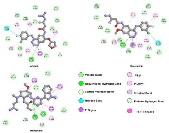 Two-dimensional representation of second-generation inhibitors, afatinib and dacomitinib, and third-generation inhibitor, osimertinib. Although all three drugs follow a similar binding mode to first-generation inhibitors through hinge-binding scaffolds, osimertinib lacks interactions with the allosteric pocket. The proximity of the drugs’ warhead to C797, its covalent bond partner, is also depicted. Interactions were analyzed and plotted using Discovery Studio Visualizer [57]. Atoms color scheme: carbon (grey), nitrogen (blue), oxygen (red), chlorine (green), and fluorine (light blue).