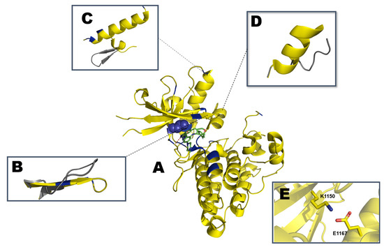 Schematic representation of (A) partially active ALK kinase domain with crizotinib (PDB: ID 5FTO). Mutation hotspots are indicated in blue with L1196 depicted as spheres. Representation of the regulatory (B) β1 and β2 strands with P-loop (residues G1123-G1128), (C) unique YCFAGKTS motif (residues Y1096-S1103) in grey packed against the αC-helix (residues E1158-K1173), and (D) αAL motif (G1272-R1279) from the activation segment (residues D1270/F1271/G1272 to E1299) are highlighted and aligned with the inactive conformation in gray (PDB: ID 3L9P). (E) K1150 from β3 strand engaging in a salt bridge with E1167 in the αC-helix.