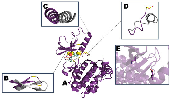 The N-terminal presents a conserved glycine-rich (GxGxΦG) loop, occurring between the β1- and β2-strands, responsible for positioning the β- and γ-phosphate groups from the ATP molecule for catalysis. The glycine-rich loop is also known as the G-loop or P-loop, with the latter being the most common in kinase-related literature. The β1- and β2 strands also harbor the adenine moiety of ATP, contributing to its stabilization [27]. Within the N-terminal lobe, a characteristic interaction is often observed involving a conserved lysine from β3-strand and a glutamate residue occurring in the αC-helix, this salt bridge is a precondition for the active state. The presence or absence of such interaction is based on the positioning of the roving αC-helix. In the kinases, in this review, once the αC-helix is orientated toward the ATP binding pocket and the salt bridge is present it can be classified as αC-in. The outward positioning of the helix and absence of the lysine-glutamate interaction is known as αC-out [28]. The rotation of the αC-helix is often used in MD studies to classify the resultant structures into either active or inactive [29].
