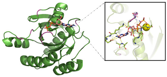 Although the αC-helix positioning and salt-bridge presence are necessary for the full activation of the protein, they are not sufficient. The C-terminal lobe contains a flexible segment, the activation segment, or A-loop, a motif often initiated by a conserved sequence of Asp-Phe-Gly (DFG) whose rotation has major effects on ATP binding pocket occupancy. Once the kinase is in an active conformation, the side chain of the aspartate residue occupies the ATP binding pocket (DFG-in), thereby coordinating a magnesium ion, and the activation segment is presented in an uncoiled, extended conformation [30,31].