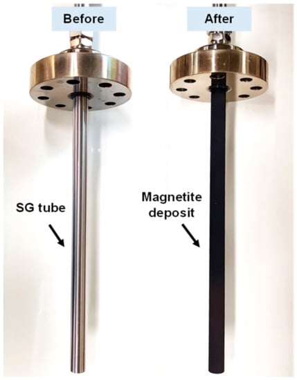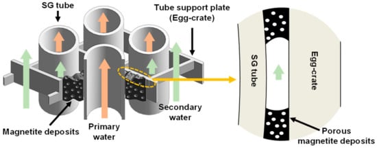 In the secondary coolant system of pressurized water reactors (PWRs), carbon steel, which exists in large numbers of pipings (i.e., feed-water lines, condensate components, separator drains, and heater drain systems) of steam generators (SGs), is greatly affected by the flow accelerated corrosion []. During the flow accelerated corrosion, carbon steel piping is oxidized to magnetite under the alkalized reducing conditions of PWRs. Afterwards, some parts of magnetite formed on carbon steel piping are removed and transported into the SGs and continuously accumulated on the secondary side of SG heat exchanger tubes, tube support plates (TSPs), and tops of tube sheets, thereby deteriorating the integrity of SGs [,].