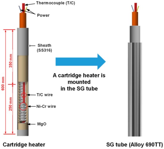 One side of the tube was welded with a cap made out of a commercial Alloy 600 rod to prevent the water leaking into the tube. Afterwards, a cartridge heater of 600 mm length was mounted into the test tube to provide the heat source onto the inner surface of the tube, which was simulated as the primary coolant water. As shown in Figure 2, the cartridge heater was composed of a thermocouple, a thermocouple wire, an Ni-Cr wire, magdenesium oxide, and a sheath made of stainless steel 316. During the mounting of the heater into the tube, magnesium oxide was used to thinly cover the surface of the cartridge heater to increase the heat transfer in the circular gap between the tube and cartridge heater. The heater-mounted SG tubes were dried in an oven at 60 °C for 10 h. After the drying process, the outer surface of the SG tube specimens was cleaned using acetone.