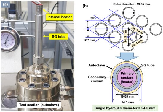 After the drying and cleaning process of the SG tube, the SG tube was then installed into the test section (Figure 3a). As shown in Figure 3b, the flow path area was designed by considering the single flow path area of the free span of the SG tube of OPR1000 from the first standard PWR plant in the Republic of Korea. The distance between both centers of the SG tubes was 24.5 mm, which is the size of a single flow path diameter including one SG tube, and the outer diameter of the SG tube was 19.05 mm, which was considered in the design of the test section.