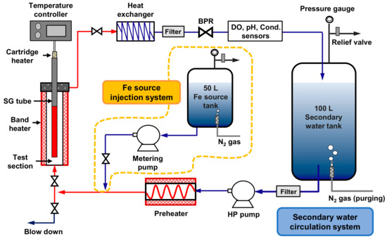 Figure 4 presents a schematic of the secondary loop system for the magnetite deposition test. The recirculating loop system consists of the following main components: a simulated secondary water solution tank; an Fe source tank filled with Fe(II)-acetate solution; a high pressure (HP) diaphragm pump; a preheater for control the temperature of inlet solution; a metering pump for Fe source injection; a heat exchanger for cooling water; a back pressure regulator (BPR) for pressure control; various water chemistry sensors for dissolved oxygen (DO), pH, and conductivity; a test section installed with a heater-mounted SG tube specimen; and a temperature controller. The water chemistry parameters, pressure, and temperature at various positions in the test section were monitored in the temperature controller using digital gauges. In order to start the deposition test, the pressure of the test section was slowly increased to 60 bar using the back pressure regulator, and the temperature of simulated secondary water near the surface of SG tube was continuously maintained at 270 °C to keep the SNB conditions by operating the pre-heater, line heater, ceramic heaters surrounding the test section, and cartridge heater inside the SG tube specimen. The heat flux of the cartridge heater was maintained at 30 W/cm2. The flow rate adjacent to the SG tube was continuously controlled at flow rate of 260 mL/min, and the dissolved oxygen concentration was maintained below 5 ppb, which is a typical water chemistry guideline of the Electric Power Research Institute []. Water chemistry parameters for affecting the corrosion behavior of secondary system are pH, dissolved oxygen concentration, temperature, and concentration of various impurities (Fe, Na, Cl, S, and Si) []. Electric Power Research Institute water chemistry programs have been established for operating PWRs to minimize corrosion problems and, thereby, to maximize the reliability of the secondary system []. Under the stabilization of dissolved oxygen concentration, temperature, and pH value, the magnetite deposition test was performed for 14 days. Each deposition test was performed at least two times for reproducibility. Table 2 summarizes the main experimental conditions for the magnetite deposition tests.