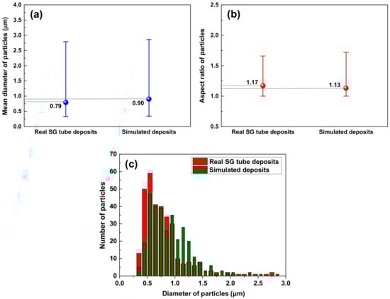 Figure 7 presents the particle characteristics such as mean size, aspect ratio, and size distribution. As shown in Figure 7a, the mean diameter of the simulated deposit particles was relatively larger than that of real flakes, but the distribution range is almost similar. The aspect ratio of the simulated deposit particles was nearly same as that of the real deposit particles (Figure 7b). The simulated deposit particles and real SG deposit particles with diameters ranging from 0.3 μm to 1.2 μm constitute 81% and 89%, respectively (Figure 7c). On the basis of these results, we think that the simulated deposits were appropriate to simulate the real SG tube deposits from the viewpoint of particle size and morphology.