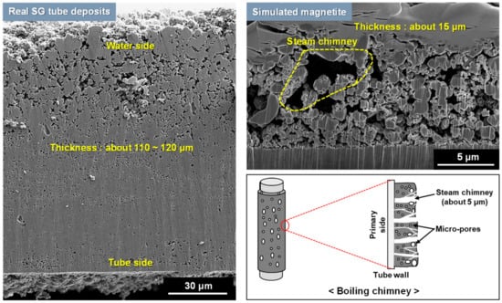 To prevent these problems owing to SG deposits, chemical [] or mechanical cleanings [] and high pH water treatment [] of the secondary circuit have been developed and are widely used in the PWRs. Among them, chemical cleaning is currently the most effective strategy for removing the corrosion products in SGs. However, chemical cleaning is difficult to perform and could damage some parts of the SG owing to the corrosive properties of the chemical cleaning solution [,]. Hence, it is of great interest to investigate alternative strategies to reduce the SG fouling and TSP blockage. To study the magnetite removal method and dissolution behavior of the magnetite deposits, a suitable porous magnetite specimen deposited onto SG tubes should be provided for the researchers.