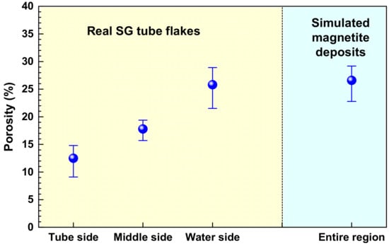 Figure 9 presents the porosity of the simulated deposits and the flakes. The thickness of the flakes was much greater than that of the simulated deposits. Hence, the flakes were divided into the three regions by location: (1) water side, a region exposed to high temperature water; (2) tube side, a region in contact with the surface of an SG tube; and (3) middle side, an intermediate region between the water and tube sides. The porosity of the flake samples increased from the tube side to the water side. This result may be closely related with the bubble growth and steam chimneys from the tube side to the water side [,]. Although the porosity of the entire region of simulated deposits was quite different from that of the flake samples, the porosity of the simulated deposits was almost the same as that of the water side of the flake samples, with about 26% porosity.