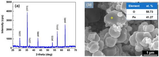 Figure 10a presents the XRD patterns of the simulated deposits. The diffraction peaks of the simulated deposits were well coincided with the XRD reference data of pure magnetite (PDF number 00-019-0629). In addition, Figure 10b shows a typical chemical composition of the simulated deposit particle using SEM-EDS analysis, which shows that the particle was identified as magnetite. The XRD and SEM-EDS data confirmed that the simulated deposit was pure magnetite, which means the deposition test well simulated the actual SG tube deposits because the actual SG tube deposits mainly consisted of magnetite (about 90~95%).