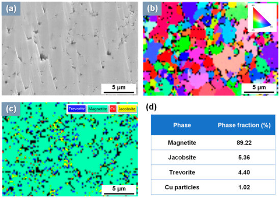 Figure 11 presents the EBSD data of the real SG tube flakes. As shown in Figure 11a, the EBSD analyzed area contained the number of the pores with a size of about 0.2~1.0 μm. Figure 11b shows the 001 inverse pole figure orientation map. A random orientation was presented in pole figure orientation map because the preferred orientation color did not appear. Figure 11c shows the EBSD phase identification map. Four phases were observed in the map as follows: magnetite (Fe3O4), trevorite (Ni2FeO4), jacobsite (Mn2FeO4), and metallic Cu. Zero solutions (black regions) were also detected and randomly formed in all of the analyzed area. In these EBSD results, we believed that the micro-pores could represent the zero solutions. In general, it is well known that zero solutions are points in the scan for which no indexing solution could be found for the corresponding Kikuchi pattern []. Hence, except for zero solutions, the fractions of the four phases were simply normalized to 100%. The normalized phase fractions of the flake sample are presented in Figure 11d. These results showed that the SG tube flake samples were mainly composed of magnetite and consisted of small amounts of trevorite, jacobsite, and metallic Cu particle. The simulated magnetite deposits were sufficiently similar to simulate the SG flakes of actual PWRs because the real SG flakes consisted of 90% magnetite and had a porous structure. Furthermore, we conclude that the various compounds of the actual SG tube flakes could be perfectly simulated using the loop system by injecting the additional sources such as Ni, Mn, Cr, and Cu.