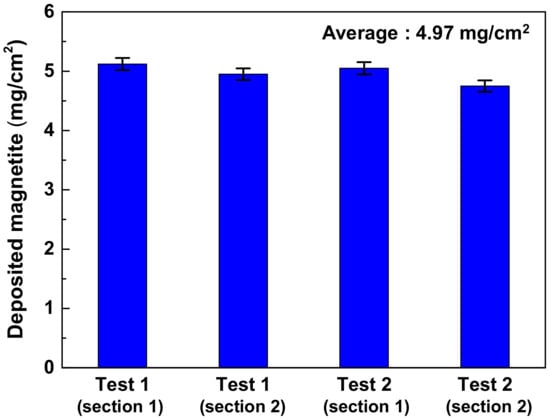 Figure 12 presents the amount of simulated magnetite deposits per unit area deposited onto the Alloy 690TT. The average amount of the deposits was 4.97 mg/cm2. Using the deposition loop system, the deposition rate of magnetite deposits was 0.36 mg/cm2·day. Good reproducibility was confirmed.