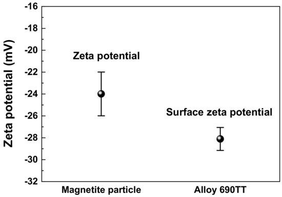 In addition, a relationship between electrostatic force and magnetite deposition was used for a better understanding of the magnetite deposition behavior on Alloy 690TT tubes. The deposition behavior of colloidal particles on a metal surface is affected by the electrostatic force between the particle and surface [,]. Therefore, we measured the zeta potential of the magnetite nanoparticles and surface zeta potential of Alloy 690TT in the secondary coolant.