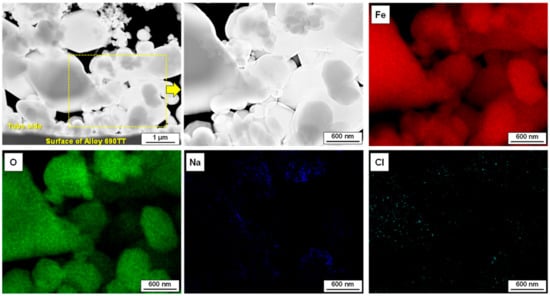 Figure 14 shows the STEM-EDS mapping analysis of Na and Cl impurities in the micro-pores formed on the tube side of the simulated magnetite deposits. The elemental maps clearly present that bulk particles consisted of Fe and O. However, as expected, Na and Cl are mainly observed on the outer surfaces of magnetite particles. As presented in Table 4, the average concentration of impurities within the micro-pores formed on the tube side of the magnetite deposits was estimated to be 4700 ppm for Na and 400 ppm for Cl by STEM-EDS point analyses. The concentration factors of impurities are defined as the ratio of impurity concentration on the pores to the concentration in the bulk water. As the concentrations of Na and Cl in the bulk solution in the test section were 0.1 ppm and 0.15 ppm, respectively, the concentration factors of Na and Cl within the deposits were evaluated to be approximately 4.7 × 105 and 2.7 × 103, respectively. In a previous study, the concentration factors of both Na and Cl within the micro-pores of real SG flakes were 4 × 104 []. The impurity concentration is a complex phenomenon that is affected by numerous factors; therefore, direct comparison of the concentration factors might be a difficult task. Nevertheless, it is concluded that Na and Cl impurities can be concentrated in the pores of the simulated deposits. Furthermore, we think that other impurities such as S and P ions could also be concentrated in the pore of simulated deposits using the loop system.